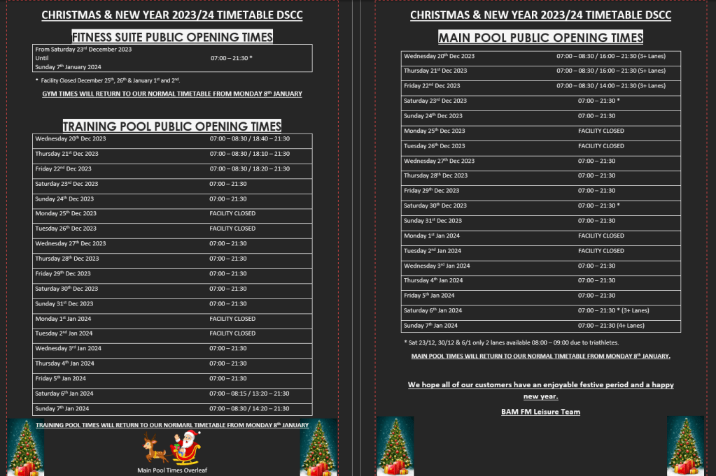 Facility Timetables over Festive Period & Into 2024 Posted bydalkeithcommunityleisureDecember 18, 2023March 29, 2024Posted inFaciltity Notices, School Holiday Times Share this: Share on Facebook (Opens in new window) Facebook Share on Pinterest (Opens in new window) Pinterest Share on X (Opens in new window) X Share on Reddit (Opens in new window) Reddit Share on LinkedIn (Opens in new window) LinkedIn Share on WhatsApp (Opens in new window) WhatsApp Like Loading...